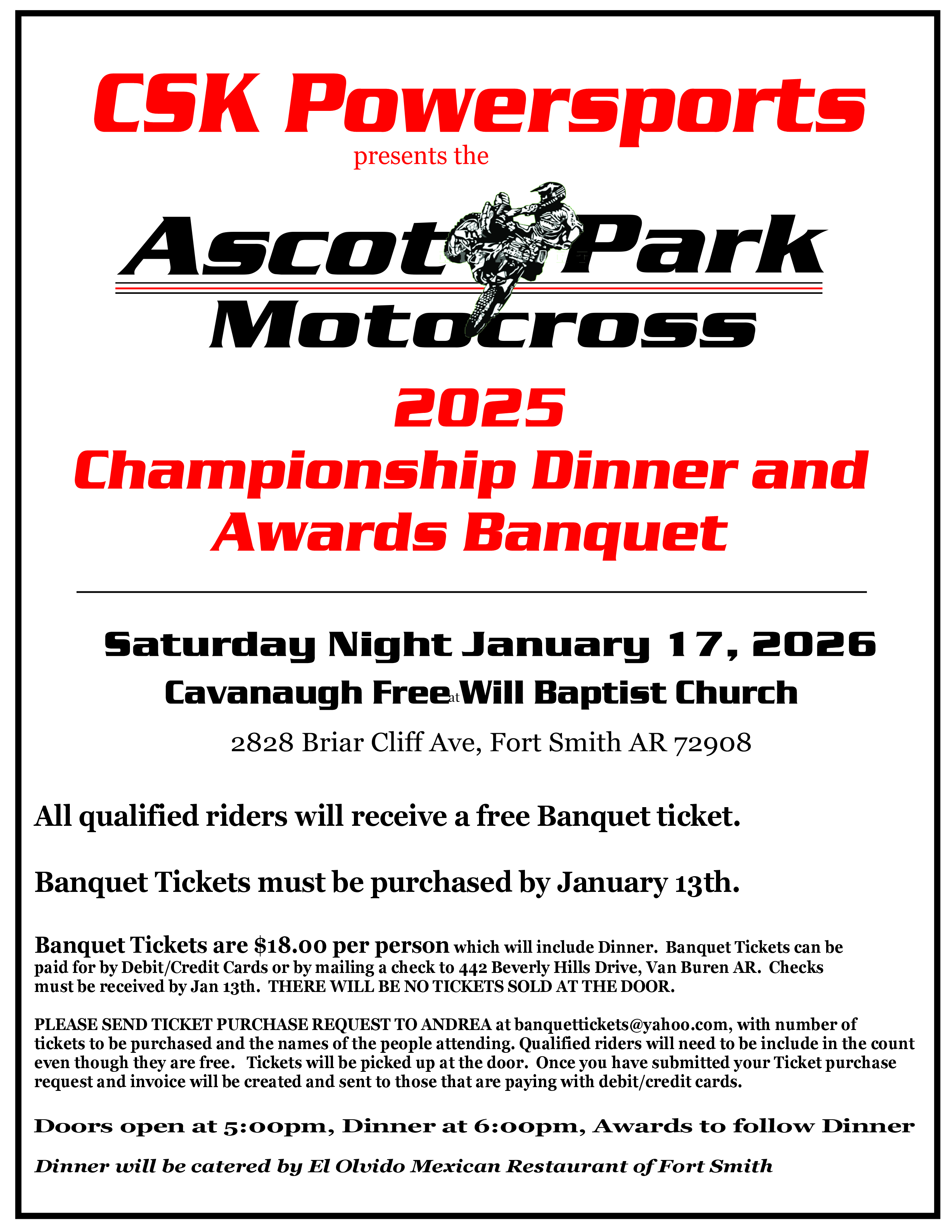 Join us January 17th for the 2025 Awards and Dinner Banquet. We will be presenting the Overall Series Awards for Mini X March Maddness Series, the CSK Powersports Mini X and Saturday Night Thunder, and the Winter Light Co. Mini X and MX Fall Series.
